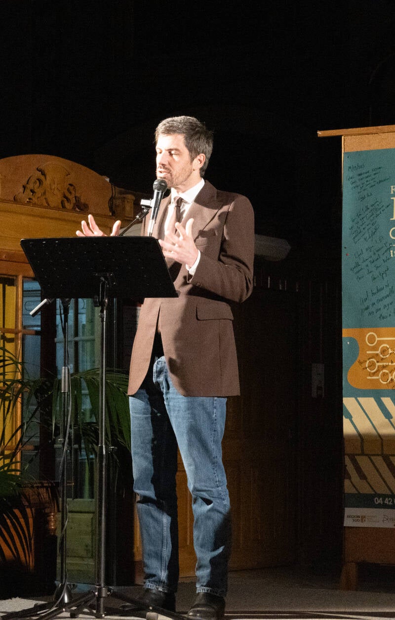 Ce soir là, les Amis du Grand Orgue de Roquevaire "Association AGOR" ont programmé une œuvre majeure: "Le chemin de Croix" avec le texte de Paul CLAUDEL conté par Vincent FERNANDEL sur une musique de Marcel DUPRE, aux cinq claviers Pierre QUEVAL.